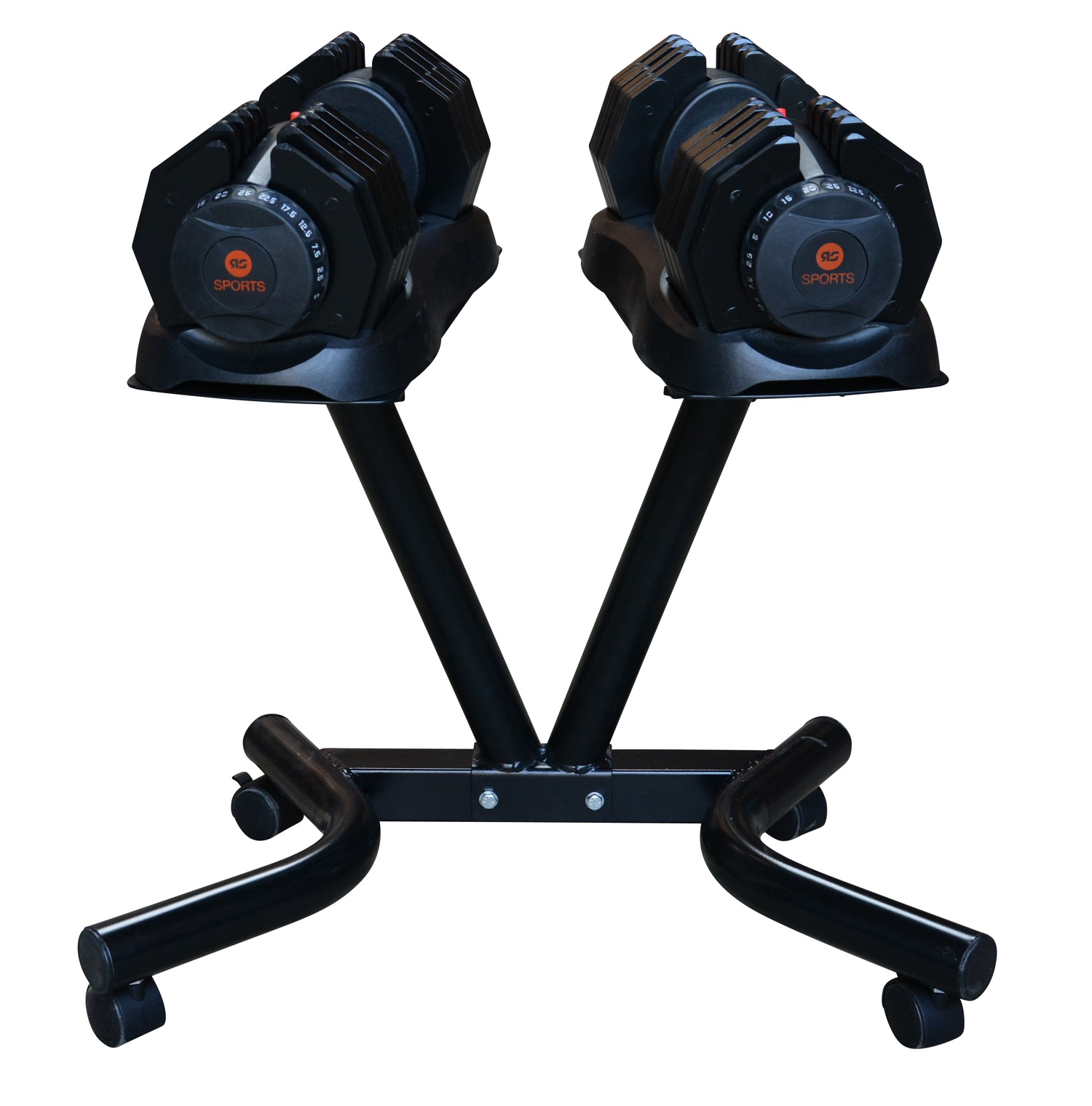 Complete selector dumbells 2 x 25KG met dumbellrekMet deze verstelbare selector dumbell van RS Sports heb je een veelzijdige dumbell in huis. Geen losse dumbells meer en losliggende schijven, maar alles strak verpakt in één basisstation. Door het unieke draaisysteem van deze RS Sports dumbell draai je in enkele seconden van het lichtste gewicht van 2.5KG naar 25KG in een handomdraai. Dus geen gedoe meer met grote dumbellrekken en 30 verschillende dumbells, maar alles in 1 dumbell.De voordelen van de RS Sports Selector Dumbell 2x25KG✓ Wisselt tussen verschillend gewicht in enkele seconden✓ Je hebt slechts één dumbbell nodig in plaats van een grote collectie die veel ruimte inneemt✓ Dankzij het rubberen banaanvormige handvat ligt de verstelbare dumbell stevig en comfortabel in de hand✓ Geschikt voor ieder niveauHet unieke draaisysteem van deze selector dumbell, je drukt het rode knopje in en je hoeft maar aan 1 kant te draaien en de gewichten staan aan beide kanten goed. In tegenstelling met andere verstelbare dumbells, dan moet je vaak aan beide kanten draaien om het juiste gewicht te krijgen. Extra handelingen en bij deze RS Sports dumbell niet nodig.Eén van de meest ruimtebesparende en toegankelijke vormen van fitnessapparatuur zijn de selector dumbells. Je hebt geen last van 15 sets dumbells die in de weg liggen op de grond. Het schakelen tussen gewichten zal stil zijn, want de dumbbells zijn namelijk voorzien van duurzame harde coating. Het geluid van ijzer- op ijzer zal er tijdens het gebruik niet zijn.Overzicht specificaties Complete selector dumbells 2 x 25KG met dumbellrek• Dumbbellstang (LBH): 40 x 20 x 23 cm.• Totale gewicht: 50 kg• 10 verschillende gewichten instelbaar: 2,5 kg. | 5 kg. | 7,5 kg. | 10 kg. | 12,5 kg. | 15 kg. | 17,5 kg. | 20 kg. | 22,5 kg. | 25 kg.• Inclusief plastic basisstation• Met dumbellrek incl transportwieltjes• Kleur: Zwart• Materiaal: KunststofZie ook de andere gecombineerde sets met 2 dumbells of met een dumbellrek voor deze selector dumbells.