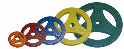 Afmetingen buitendiameter schijf + dikte schijf + kleur- 2x 0.5 kg – 14 cm – 4 cm – oranje- 2x 1.25 kg – 17 cm – 5.5 – rood- 2x 2.5 kg – 21 cm – 6.5 cm – blauw- 1x 5 kg – 25 cm – 4.5 cm – geel- 1x 10 kg – 31 cm – 5 cm – groen