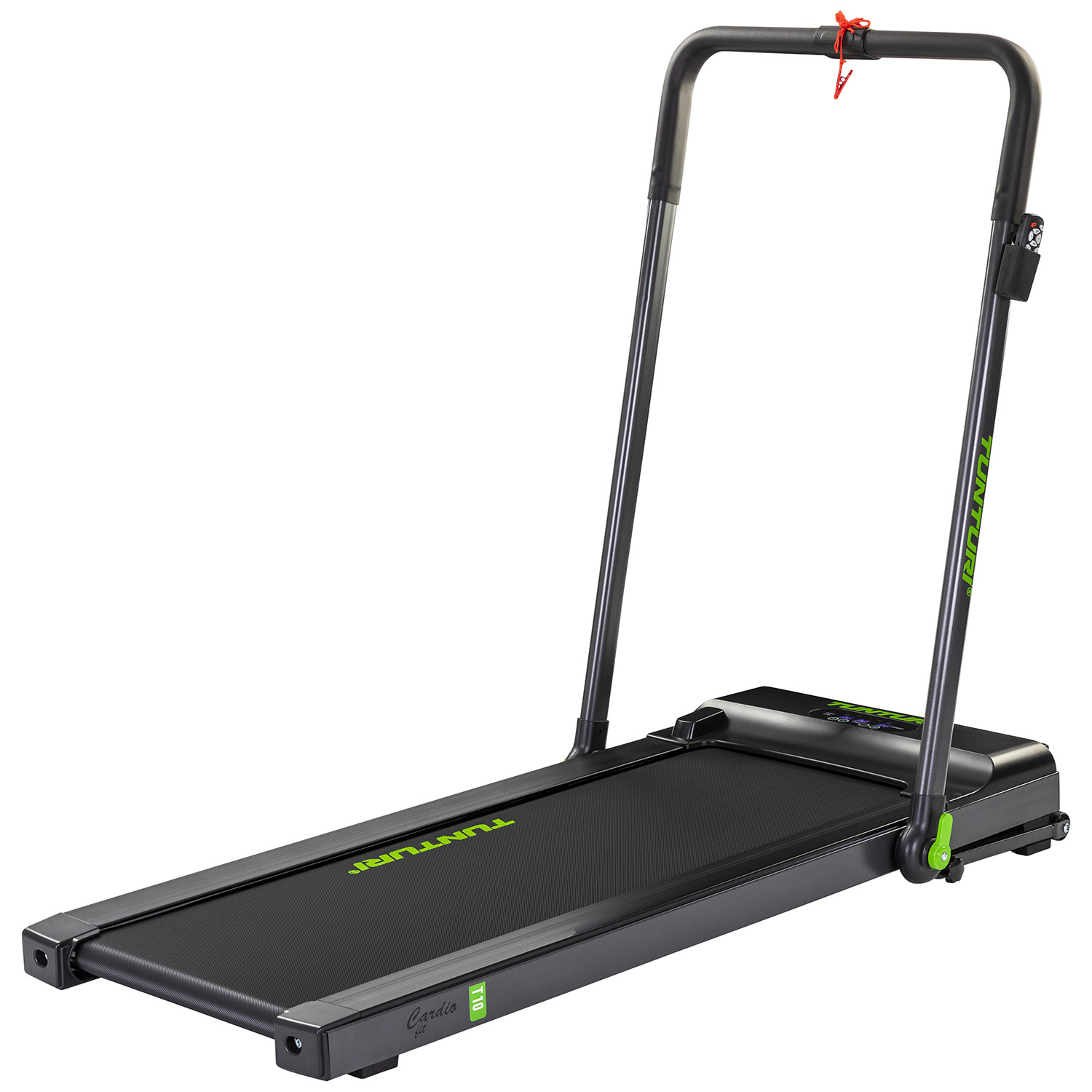 Ren jezelf fit met de Tunturi Cardio Fit T10 loopband!Je conditie op peil houden of lopen op eigen tempo vanuit huis, dat kan eenvoudig met de Tunturi Cardio Fit T10 loopband! De loopband is ideaal voor de beginnende loper en mede door de armsteun perfect om te gebruiken als je ondersteuning wil tijdens het lopen.Voordelen Tunturi Cardio Fit T10✔ Geschikt voor lopen en rennen✔ Zeer compact (ingeklapt slechts 16 cm) en eenvoudig op te bergen✔ Startsnelheid al vanaf één kilometer per uur✔ 15 mm T-Flex schokabsorberende loopmat✔ Tijdens het lopen kan de snelheid eenvoudig worden aangepast met de afstandsbedieningGeschikt voor beginnersDe Tunturi Cardio Fit T10 is een loopband die met name geschikt is voor de beginnende loper. Mede door de instapsnelheid vanaf één kilometer per uur is de loopband geschikt voor iedere loper, van beginner tot gevorderde. De stevige armsteun zorgt er daarnaast voor dat ook mensen die minder goed ter been zijn de loopoefeningen veilig kunnen uitvoeren.Eenvoudig op te bergenNa gebruik kan de Tunturi Cardio Fit T10 eenvoudig ingeklapt en opgeborgen worden. Ingeklapt is de loopband slechts 16 centimeter hoog! Ideaal om bijvoorbeeld onder het bed te schuiven of in of achter een kast op te bergen. De transportwieltjes aan het systeem maken het verplaatsen van de loopband zeer eenvoudig. Ben je toe aan een nieuwe training, dan is de loopband binnen no-time gebruiksklaar en kan de nieuwe training gestart worden.Comfortabel lopenDe loopoefeningen op de Tunturi Cardio Fit T10 worden uitgevoerd op een 15 millimeter T-Flex schokabsorberende loopband. Deze mat zorgt voor maximaal comfort bij de trainingen.Op het geïntegreerde LED display worden de verrichtingen nauwkeurig en helder weergegeven. Naast de bediening door middel van het LED display, wordt er een handige afstandsbediening meegeleverd waarmee de Tunturi Cardio Fit T10 kan worden bediend, ook tijdens het lopen.Garantie: Tunturi cardio fit T10 loopbandThuisgebruikBasis Frame & lasverbindingen (niet op roest): 2 jaarLoopband aandrijfmotor: 2 jaarAlgemene en slijtage onderdelen: 2 jaarMonteur bezoek bij garantie: JaOverzicht specificaties• Maximaal belastbaar gewicht: 100 kg• Gewicht product: 36 kg• Unieke en compacte loopband• Ingeklapt slechts 16 centimeter hoog• Inklapbare armsteunen• Startsnelheid vanaf 1 km/u• Maximumsnelheid van 12 km/u• 3-ledig LED scherm• Afstandsbediening• 15mm T-Flex schokabsorberende mat• Transportwieltjes• Afmetingen opgebouwd: L 148 x B 73 x H 121 cm• Afmetingen opgeklapt: L 155 x B 73 x H 16 cm