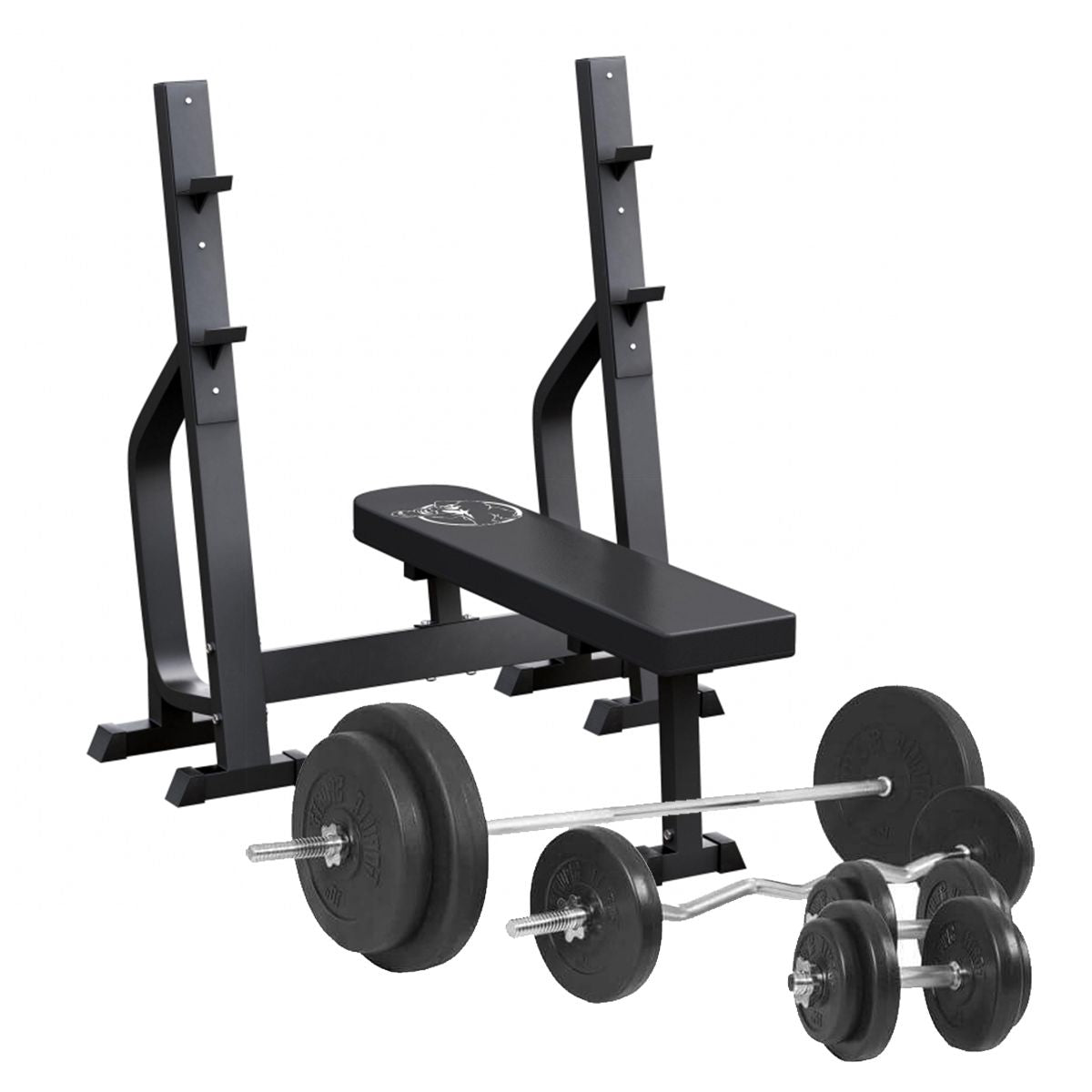 ✔ Bankdrukken✔ Borst, buik, schouders en armen ✔ Gratis verzending ✔ Haltersteunen belastbaar tot 250kg ✔ Totaal belastbaar tot 300kg ✔ 100 kg Halterset. Deze zeer stabiele vlakke halterbank is volledig toegewijd aan het bankdrukken. De maximale belasting van de haltersteunen is 250kg en de maximale belasting van de bank is 300kg. De halterbank is van staal en weegt 40 kg. De zitting is 47 cm hoog en bedrukt met het GorillaSports logo. De halterset heeft een totaal gewicht van 100 kg, bestaat uit 3 verschillende stangen en wordt aangevuld met kunststof halterschijven.